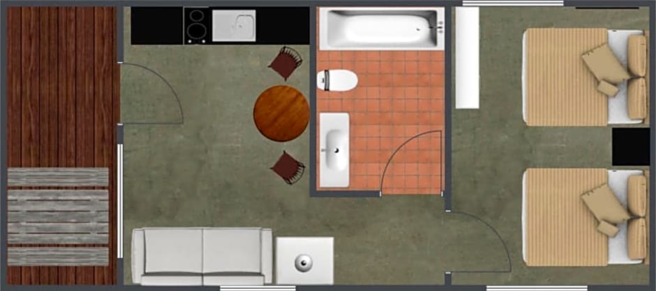 This cabin features studio-style open plan living and sleeping area with a sofa bed and kitchenette.